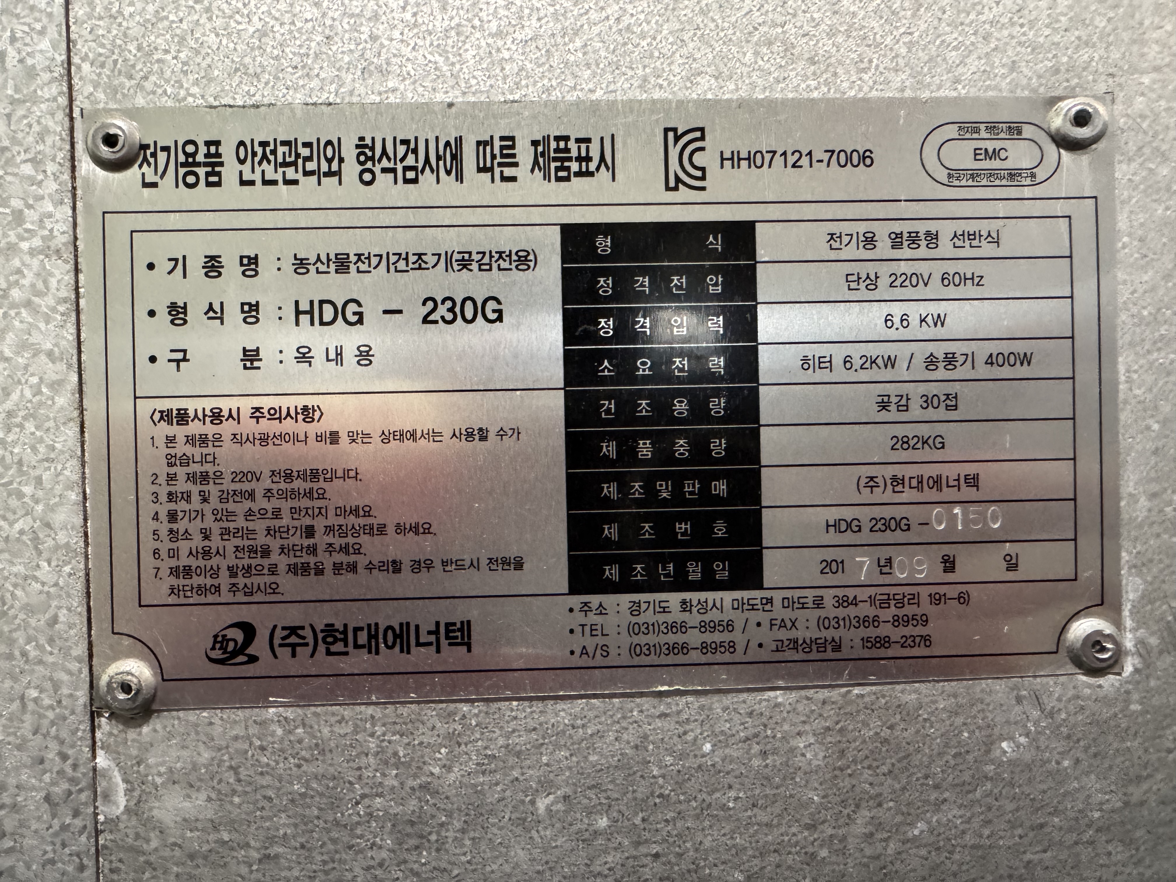 소요전력 : 히터 6.2KW / 송풍기 400W