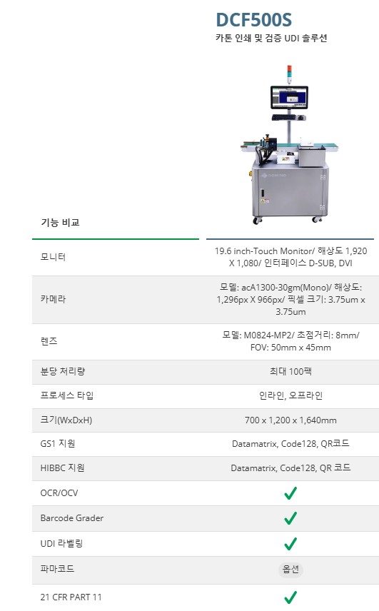 DCF-Series의 DCF500S 와 DCF5000 모델은 인·오프라인에 모두 적용할 수 있는 카톤 프린팅 및 검증 솔루션으로, 파마코드 및 바코드까지 적용하실 수 있습니다.