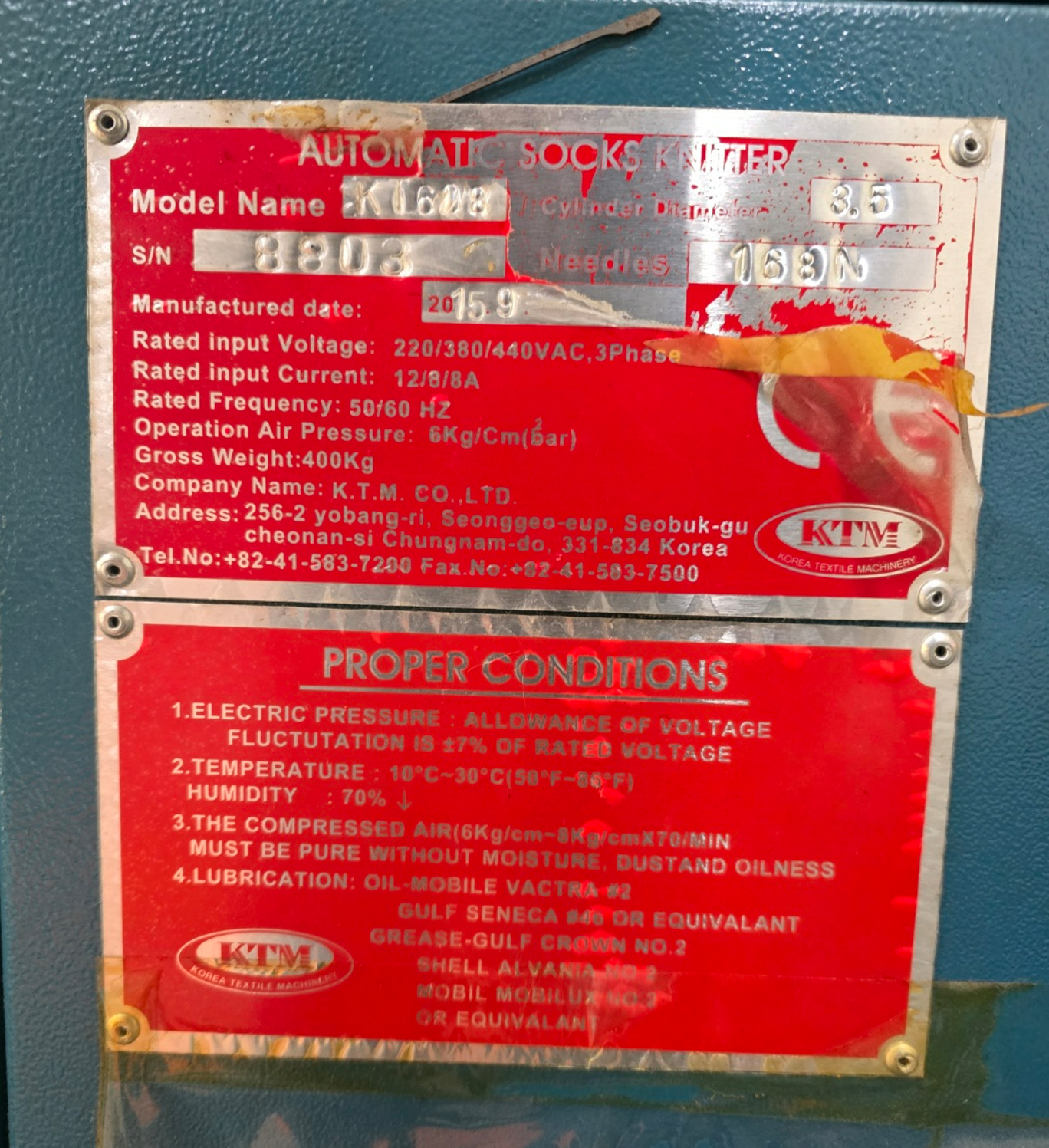 4. 전원 및 사양: 3상 380v/60hz /편직속도:330~350RPM/생산량: 일평균 22~26타