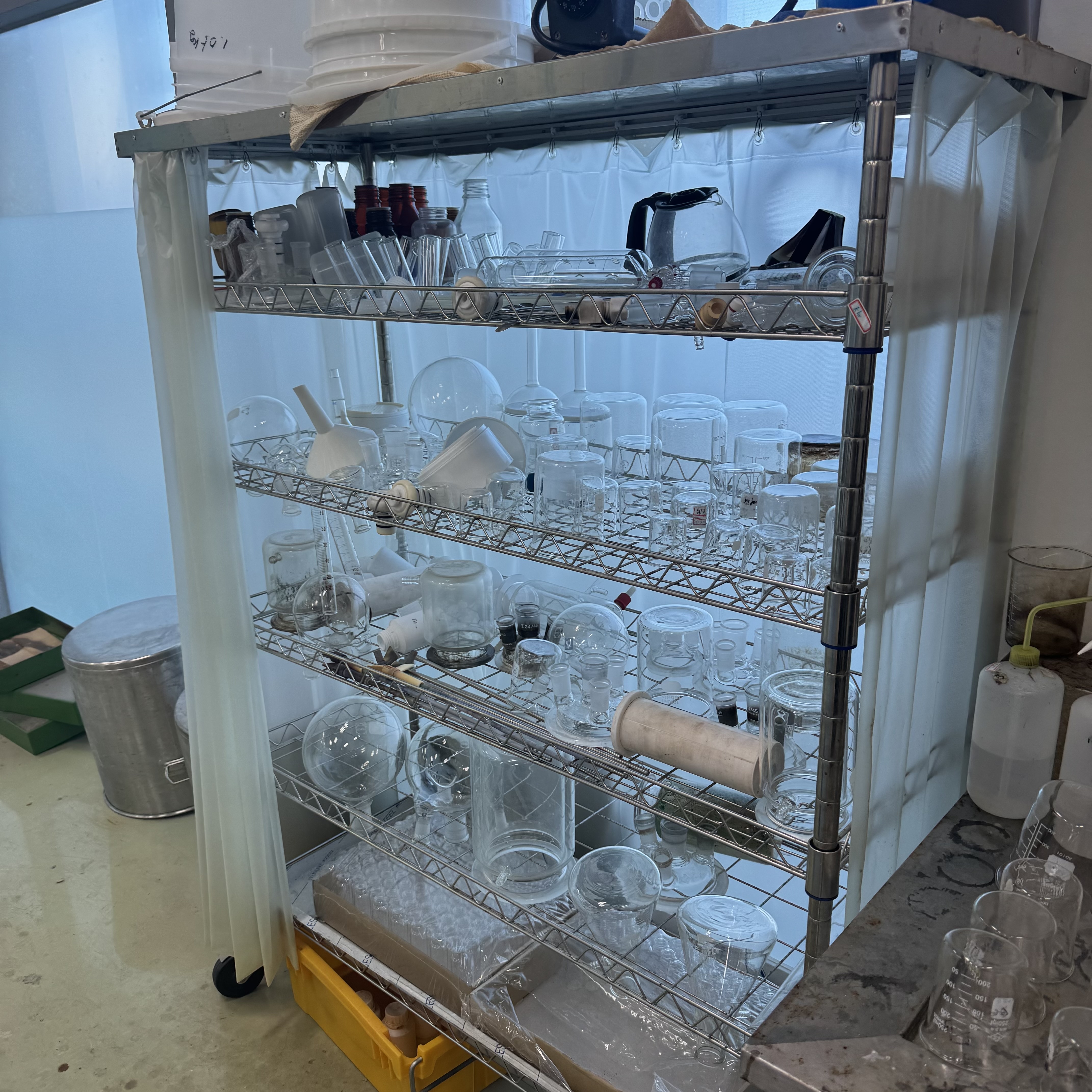 이동식 초자건조대 L-3043 입니다 크기는 1200 x 450 x 1750 기둥 재질 : SUS 304, 25∮ 파이프 Plate 재질 : SUS 304 커튼 재질 : 반투명 PE 비닐 바퀴 4개 기존 모델에 커튼이 추가 부착되어 먼지를 차단할 수 있으며, 커튼 커버는 스테인레스 판으로 제작되었고 커튼은 PE 반투명 재질입니다. 2017년쯤 78만원 정도에 최초 구매하였으며, 사용감 감안하여 많이 싸게 내놓습니다. 세금계산서 발행 가능하며, 상태 보고 결정하셔도 좋습니다. 다만 직접 가져가셔야 하며 건물 내 화물 엘리베이터 또는 화물차량 주차장 존재합니다. 위치는 경기도 용인입니다. 010-8388-4480 (주)대진유니켐 백찬렬 주임