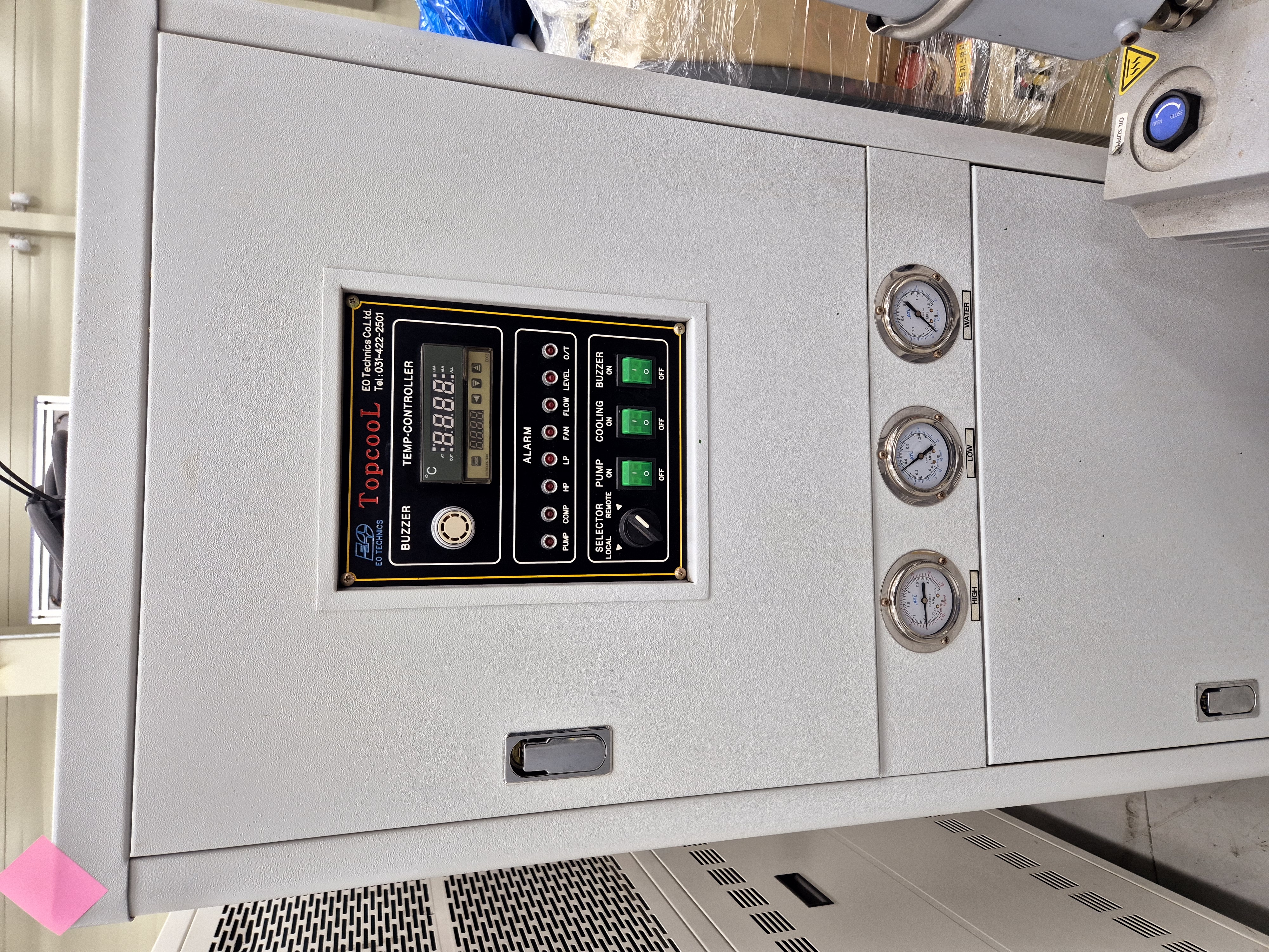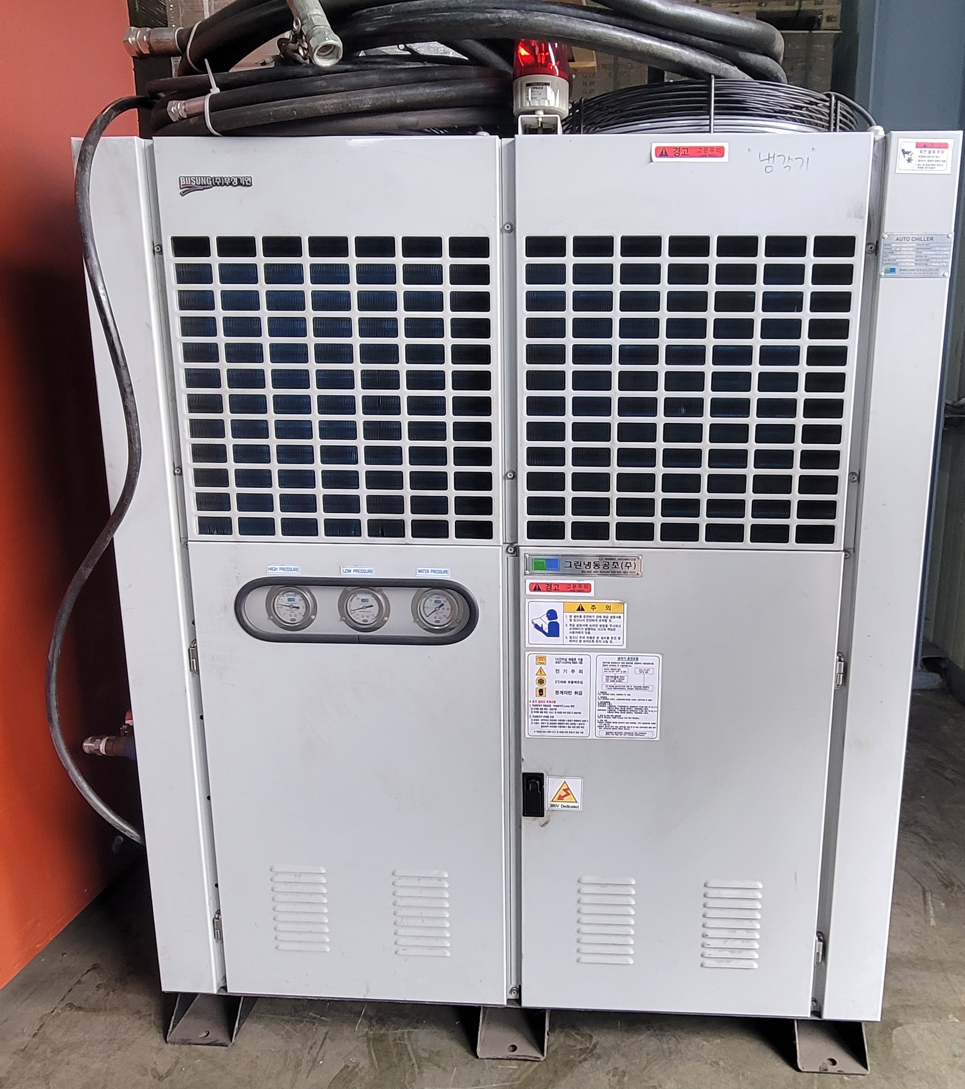 2016년에 최초 취득한 냉각기(칠러)입니다. 냉각수 순환 외 용도로 사용하지 않았으며, 작동 상태는 매우 양호하나 외관을 보면 사용감이 있으며, 상단 패널 부분 녹이 슬어 파손이 발생했기 때문에 200만원 가량에 최초 취득하였으나 많이 감가하여 판매합니다. 내부는 세척을 다시 한번 하여 깨끗하며, 작동은 양호합니다. 방문하여 상태 보고 구매하여도 괜찮습니다. 010-8388-4480 (주)대진유니켐 백찬렬 주임