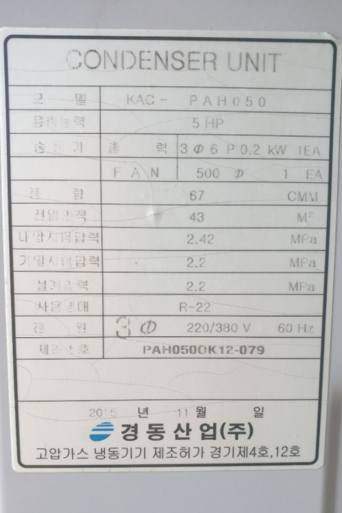 220/380V 3상,사용냉매:R22, 풍량:67CMM,전열면적:43M2
