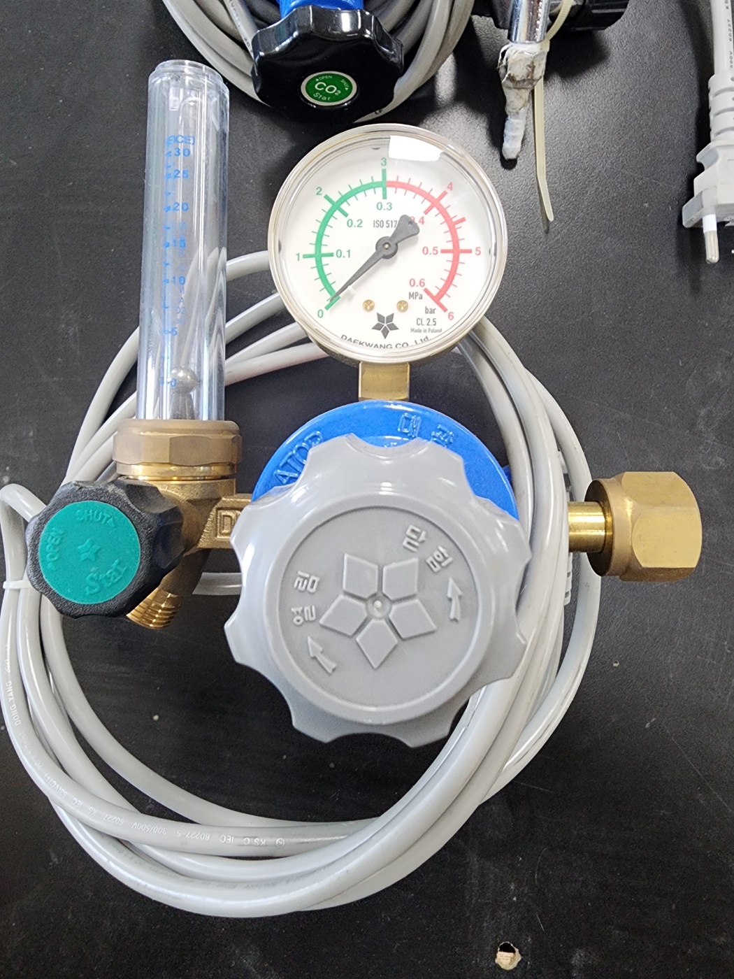 CO2 레귤레이터 입니다. 220V사용이고, 유량계 탈부착 가능 합니다.