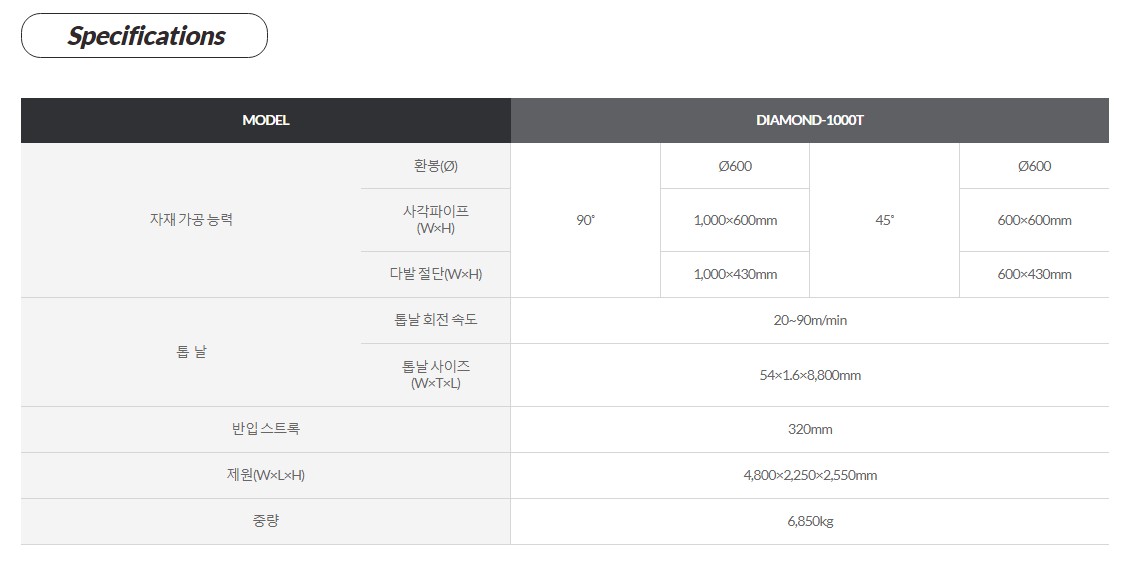DAIMOND 1000T 모델의 밴드쏘 같은 경우 위에 사진을 참고하시면 절삭능력을 알 수 있지만 환봉 600파이, 사각파이프 1000X600mm 절단할 수 있으며 다발절단의 경우 1000x430mm 절단 할 수 있습니다. 또한 각도 절단이 가능한 제품입니다. 형강 H빔, 환봉, 파이프 다발절단 등 절단에 탁월한 성능을 보여줍니다.