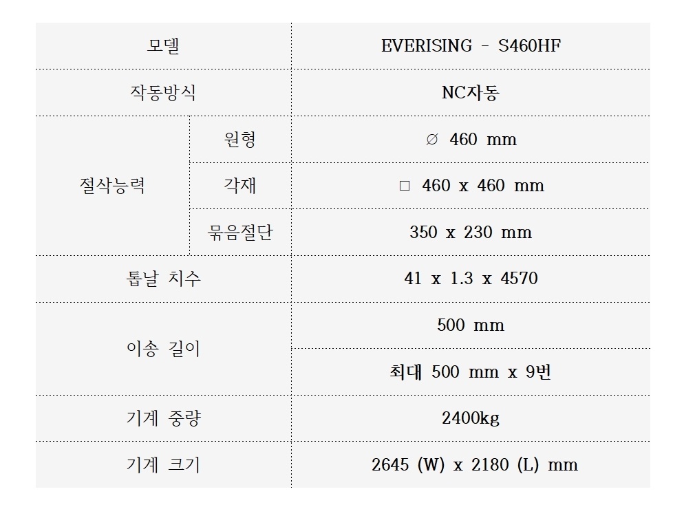 모델은 S460HF로 소재절단 460mm까지 가능합니다. 해당 모델의 정확한 스펙은 밑에 사진을 참고해주세요~